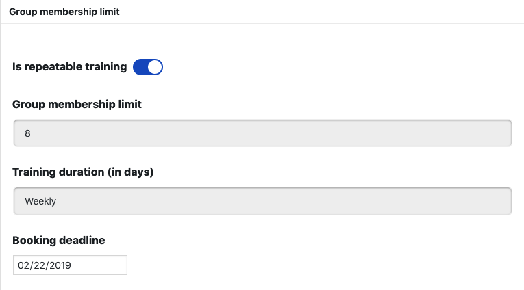 After adding a class name, you need to go to the Grouped Membership Limit section and enable the Is repeatable training option. Then you will be able to select a number of members and the duration of the training.