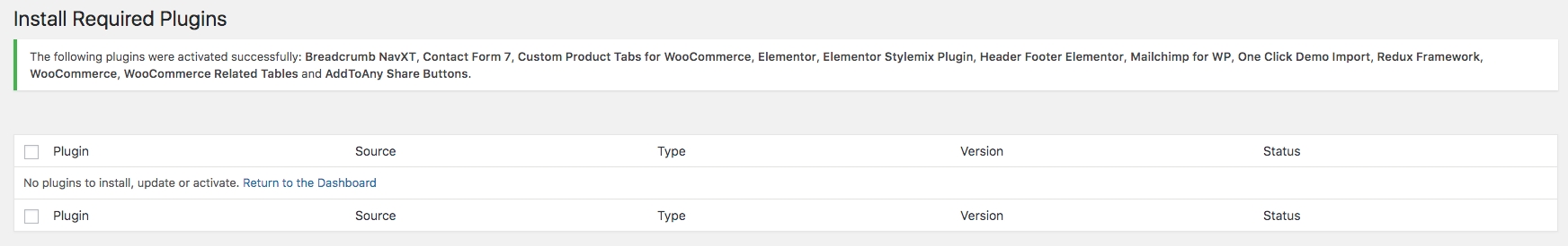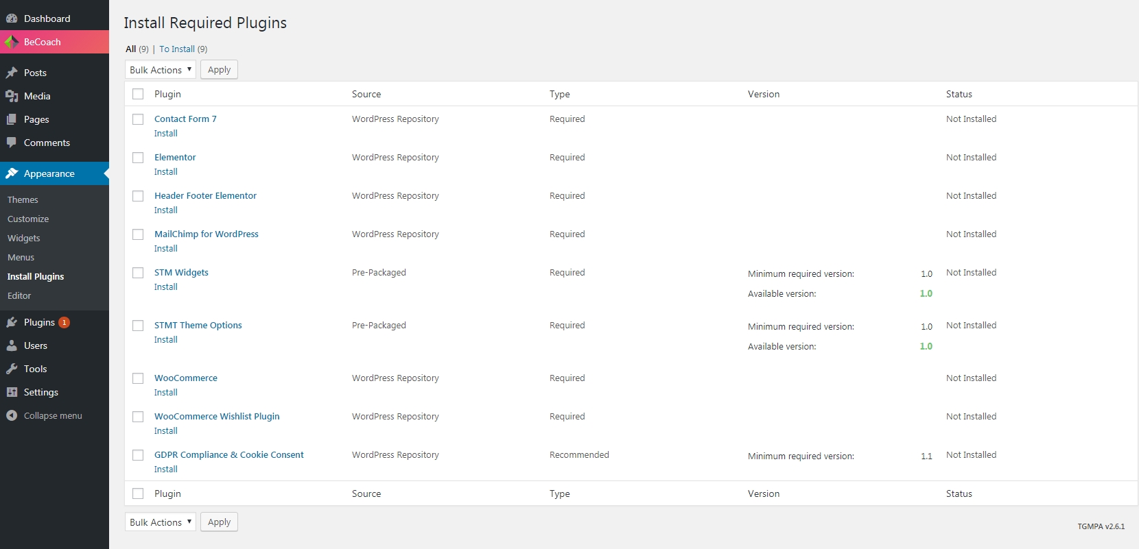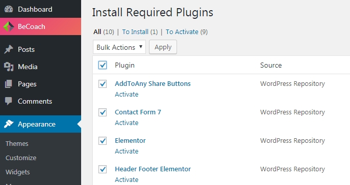 Once the theme is installed, you have to install all required plugins via Appearance > Install Plugins menu. Select All plugins and Install them via bulk Apply:
