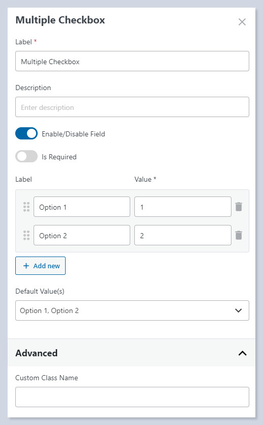 Custom Class Name – Add custom CSS classes for further styling or additional functionality for the checkbox field.