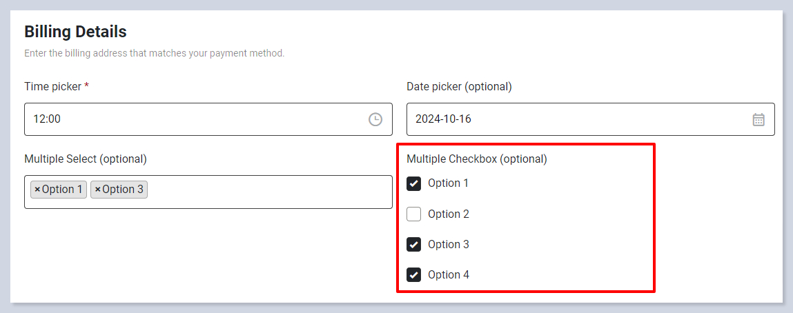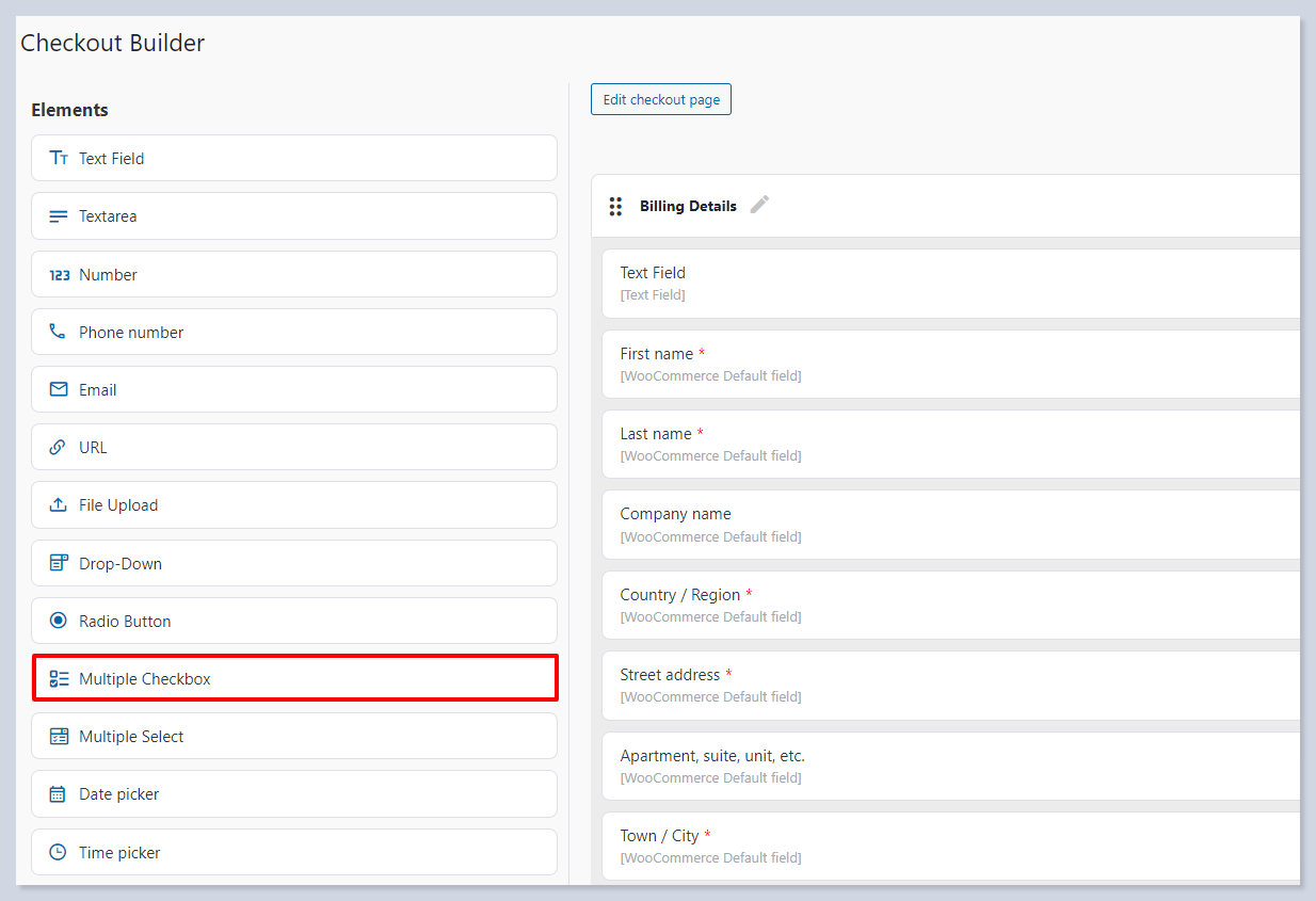 The Multiple Checkbox field allows users to select one or more options from a list of predefined choices. This field is useful when customers need to make multiple selections or when you want to give them the flexibility to choose more than one option during checkout.
