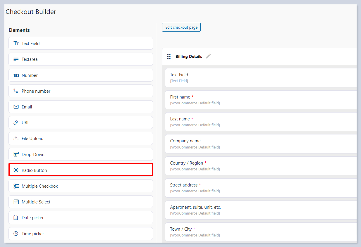 * **Custom Class Name** – Add [**custom CSS classes**](https://docs.stylemixthemes.com/checkout-custom-fields-builder-for-woocommerce/plugin-features/custom-classes) for additional styling or functionality for the radio button field.