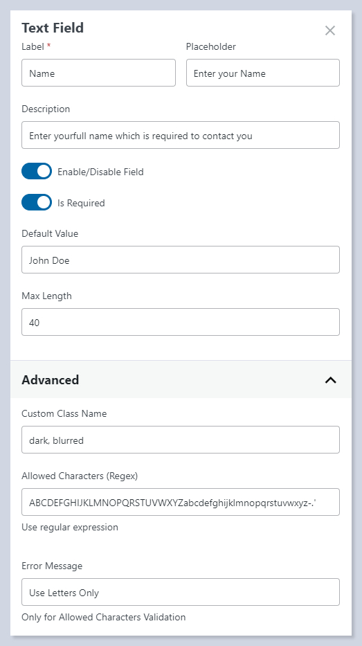 Allowed Characters (Regex) – Set a regular expression to define allowed characters that can be input into this field.