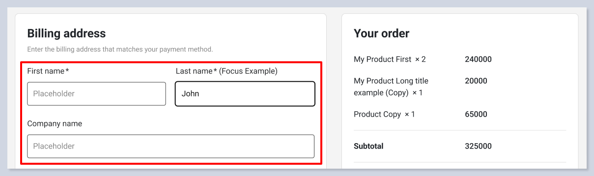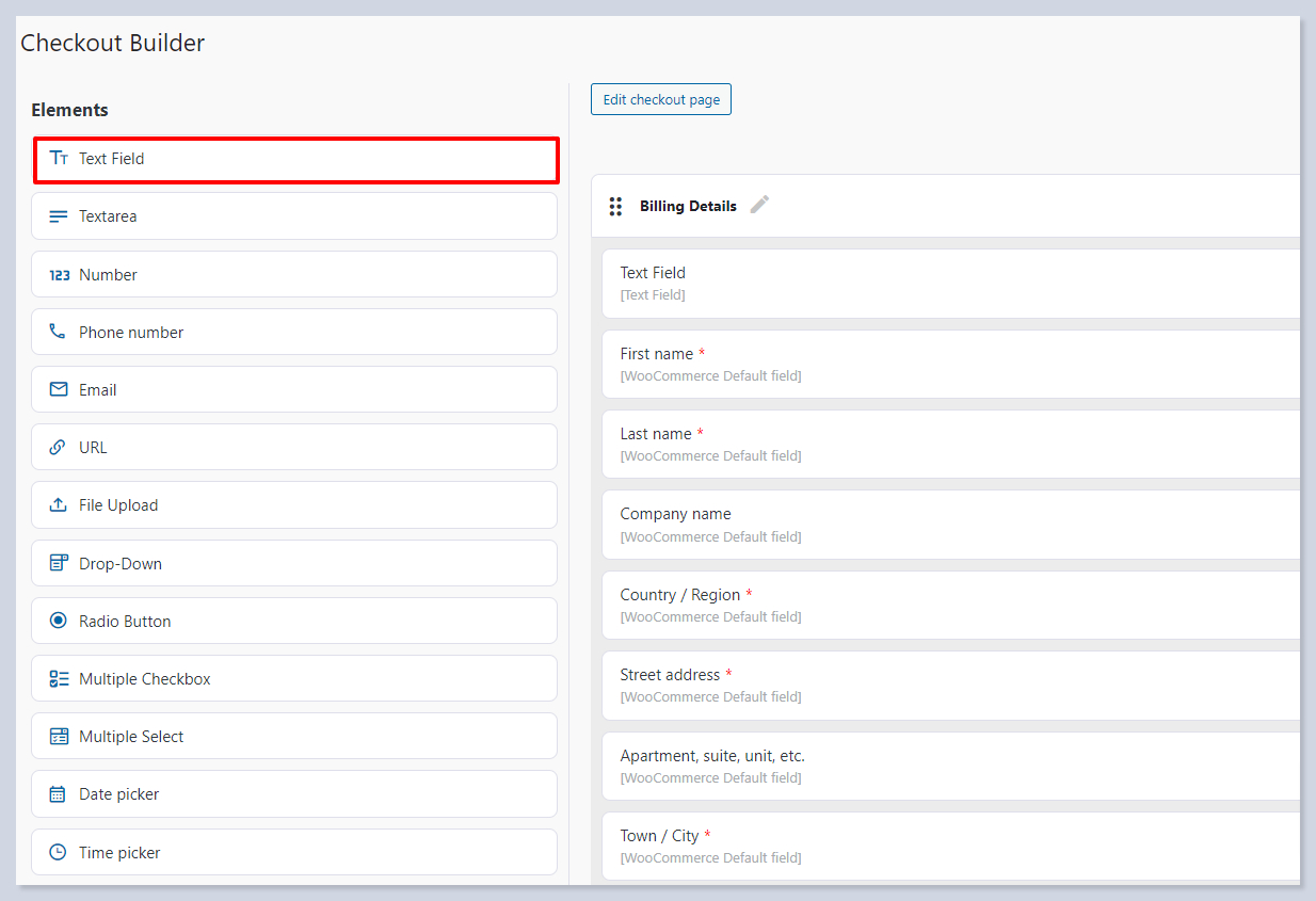 The Text Field allows you to collect basic input from users. It can be used to gather information such as names, addresses, or any other single-line text data. You can customize the label, placeholder, and other settings to match the specific needs of your store’s checkout process.