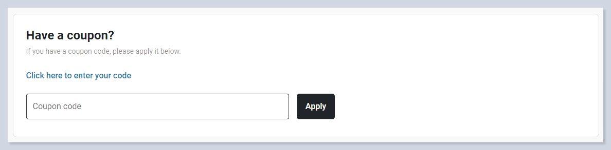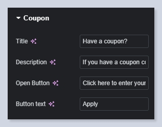 In the Coupon section, you can modify the text for the special section used for entering discount coupons in WooCommerce: