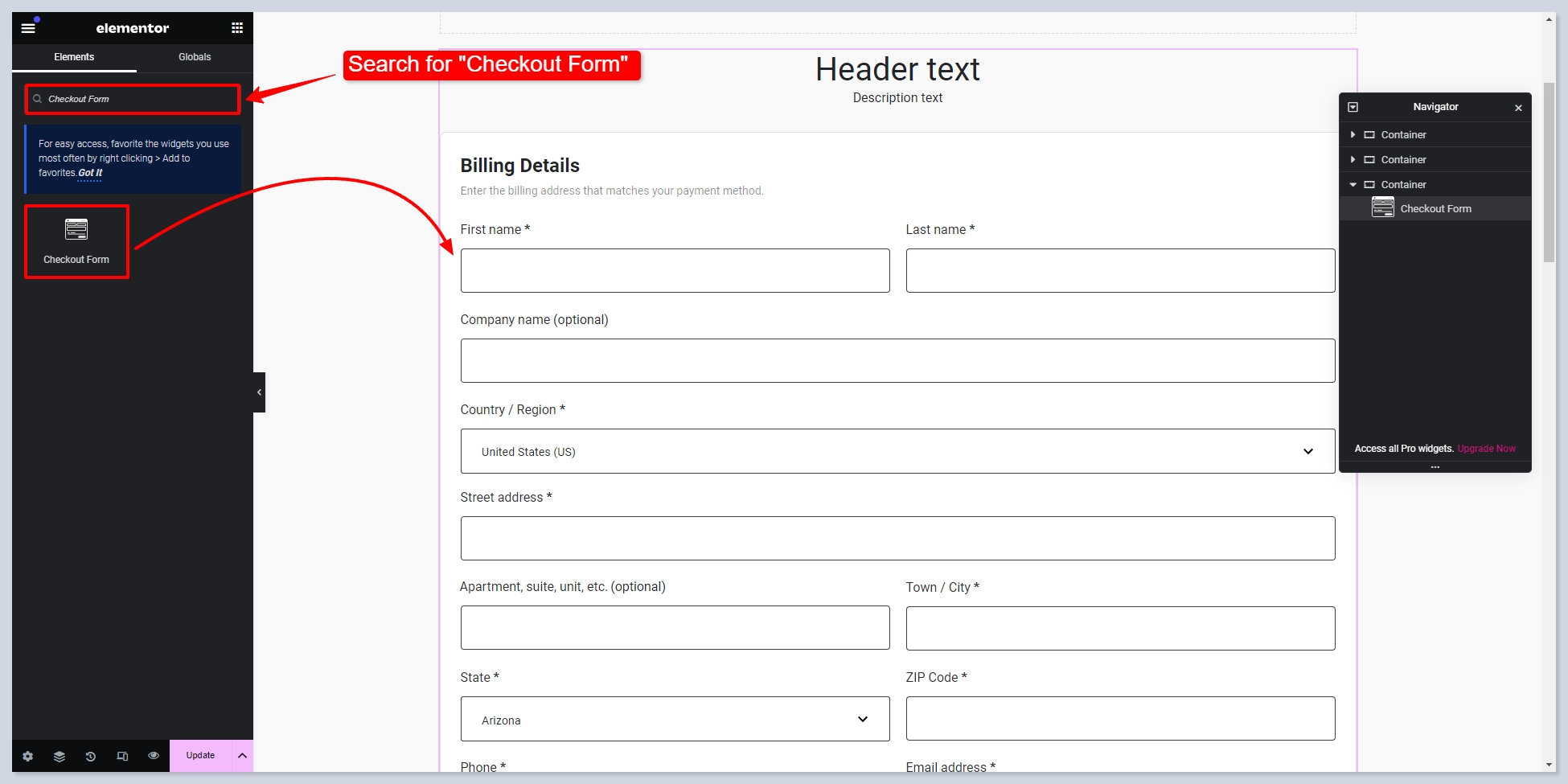 Drag and drop the "Checkout Form" widget onto the desired section of the page.
