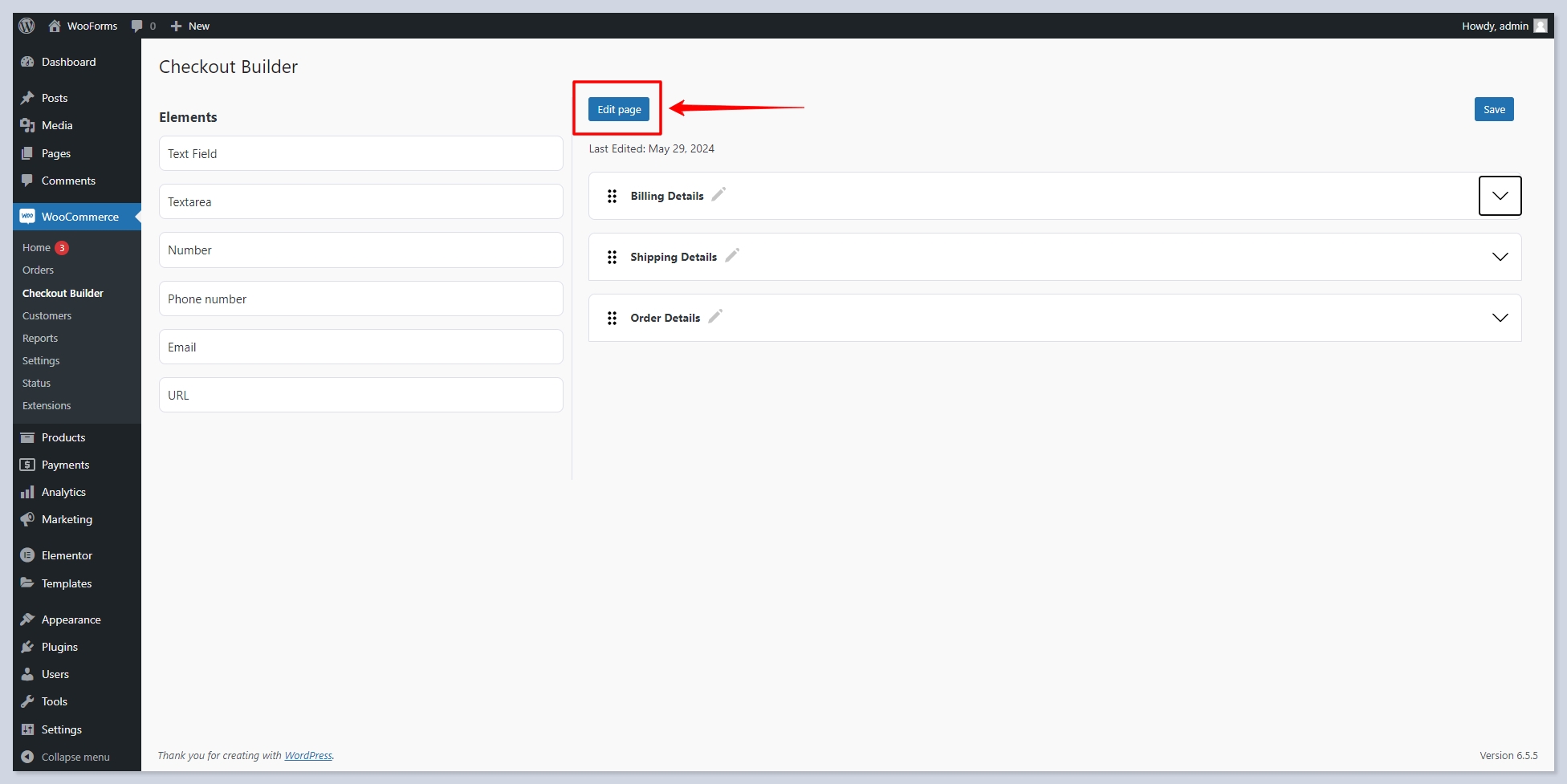 Click on the Edit Page button to open the WooCommerce Checkout page.