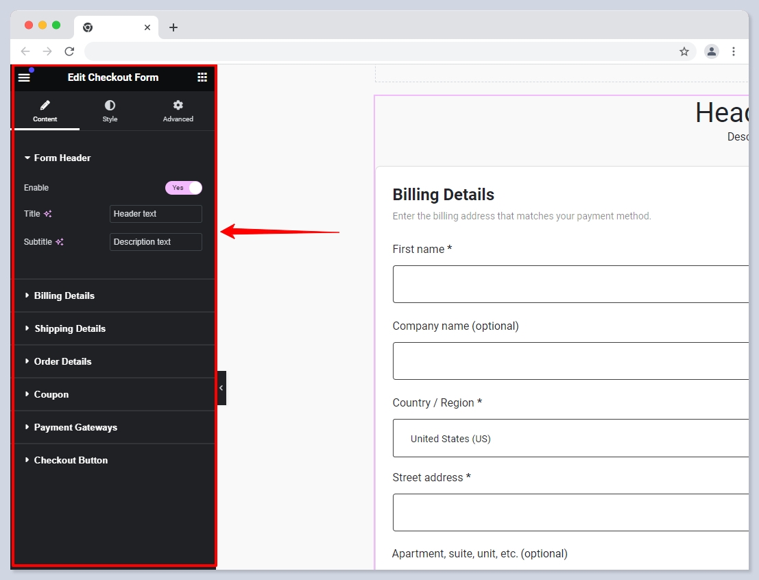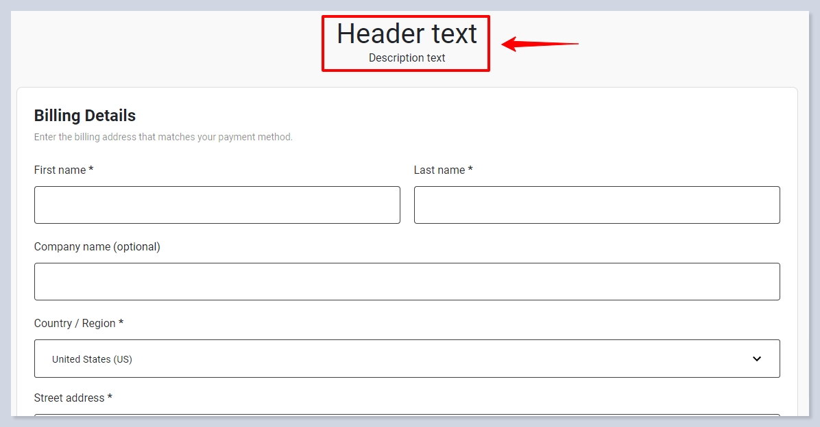 The Form Header section is responsible for changing the texts in the Header part of the Checkout form:
