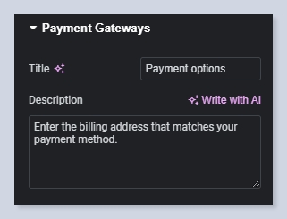 In the Payment Gateways section, you can modify the text for the special section used for selecting payment methods in WooCommerce: