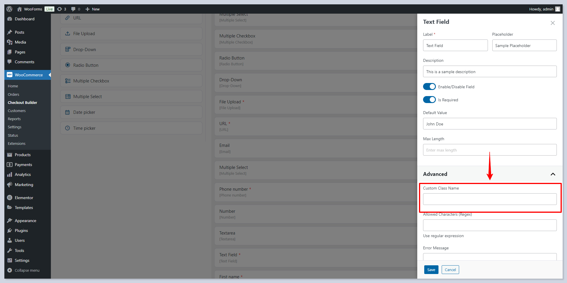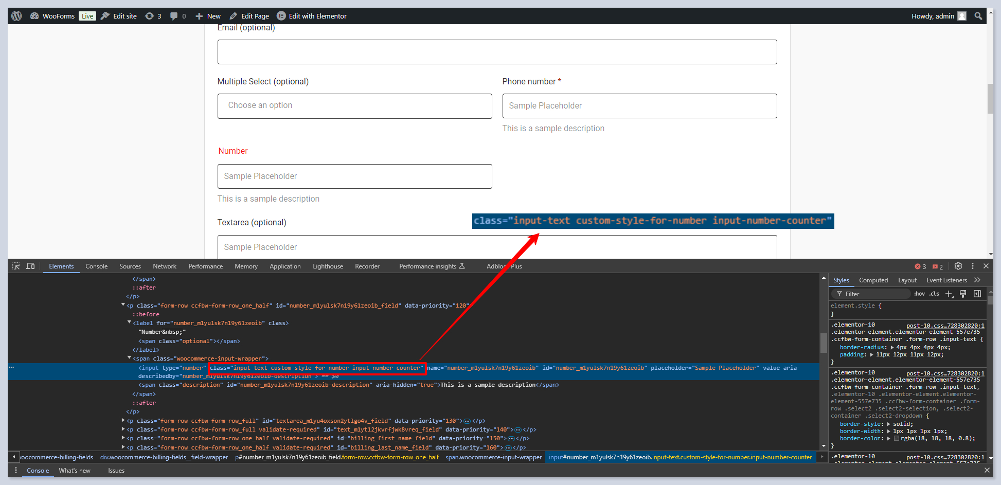 [Each element](https://docs.stylemixthemes.com/checkout-custom-fields-builder-for-woocommerce/checkout-builder-elements) within the Checkout Builder of **CCFBW**  has a field labeled **Custom Class Name in its settings**. Users can input the names of their custom CSS classes into this field to apply specific styles to those elements: