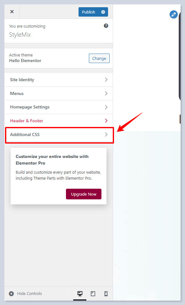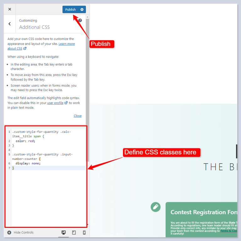 3. Define your CSS classes to the designated area and **Publish** the theme: