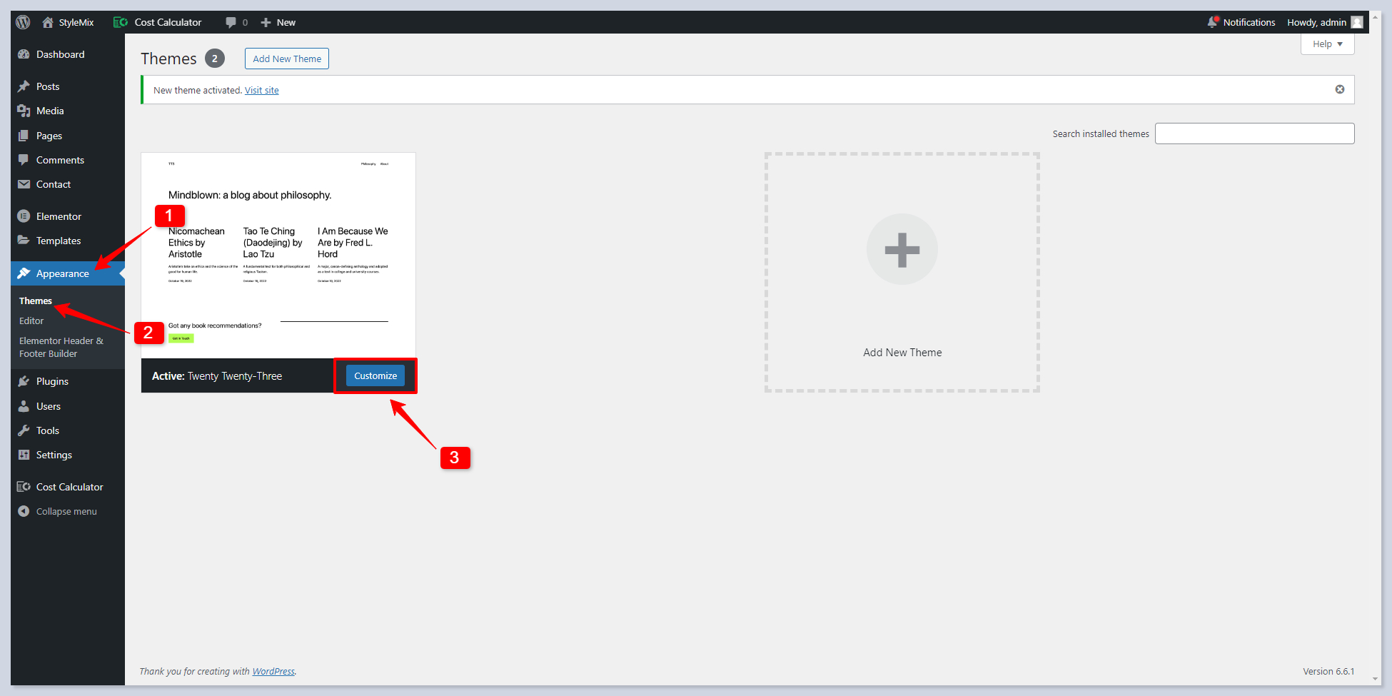 1. Follow **WordPress Dashboard > Appearance > Themes** and click on the **Customize** button in your active theme: