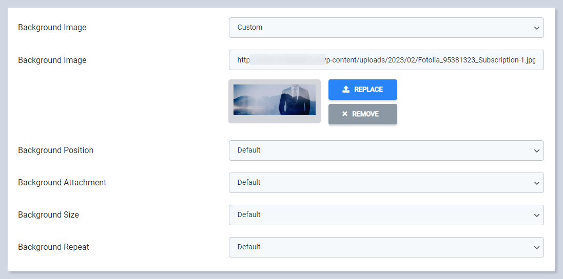 Here you can set the background image for the title box section. Upload the wished background image or enter the image URL on the Background Image field, and set up its displaying options.