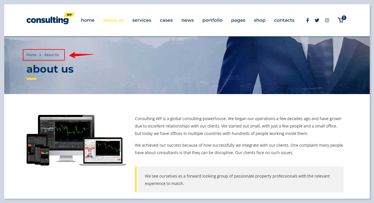 The Breadcrumbs will be displayed if the Breadcrumb NavXT plugin is installed. All the settings of breadcrumbs can be configured under the Settings > Breadcrumb NavXT section of the admin dashboard. A detailed guide about how to adjust the breadcrumbs, please read in the documentation of the plugin here.