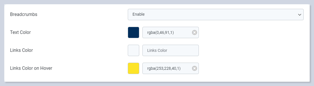 Disable/enable the displaying of breadcrumbs navigation links on the page using the Disable Breadcrumbs option.