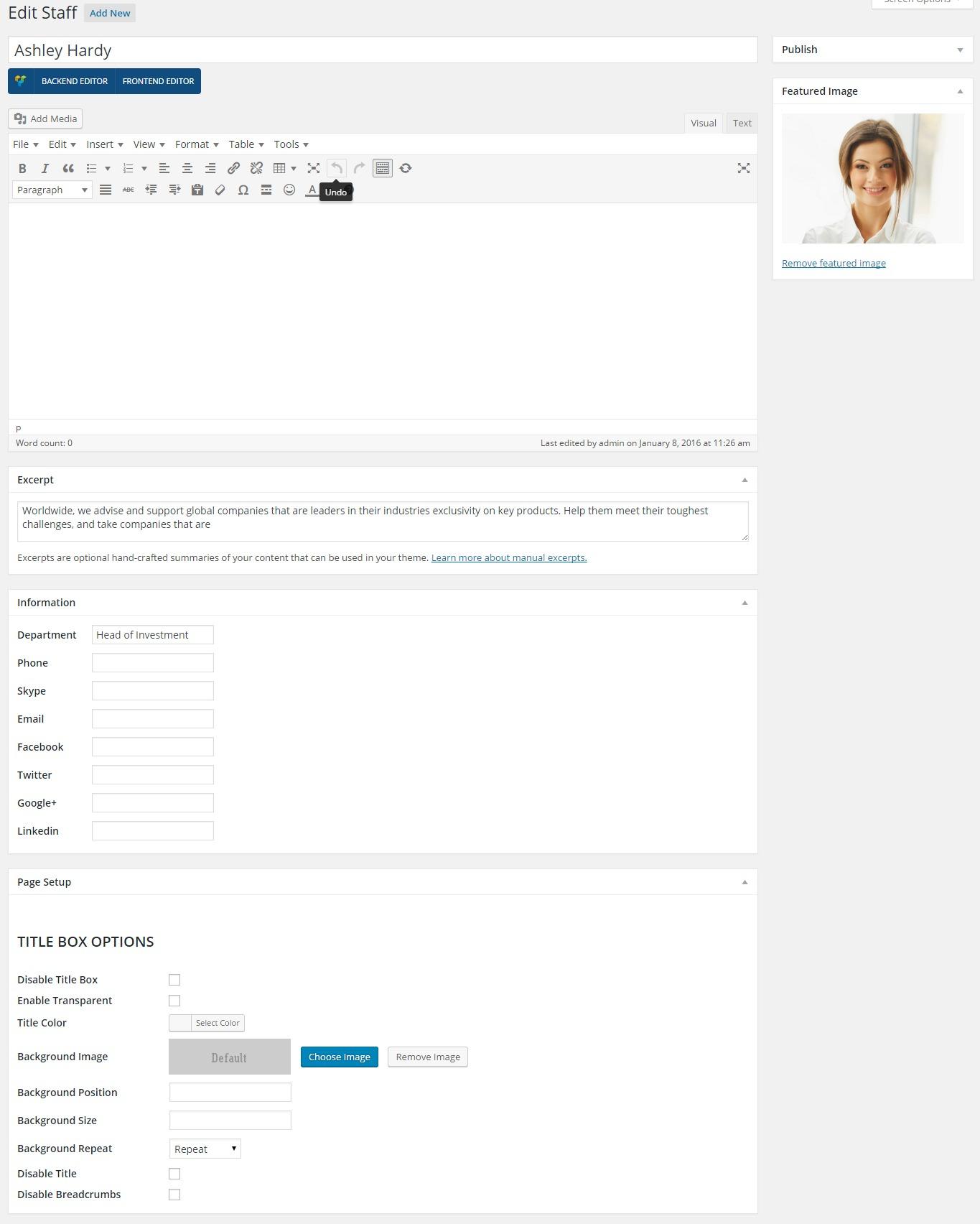 There are two view types how to display your company Team: List and Grid. You can add Staff List VC element in a page and set its options up: