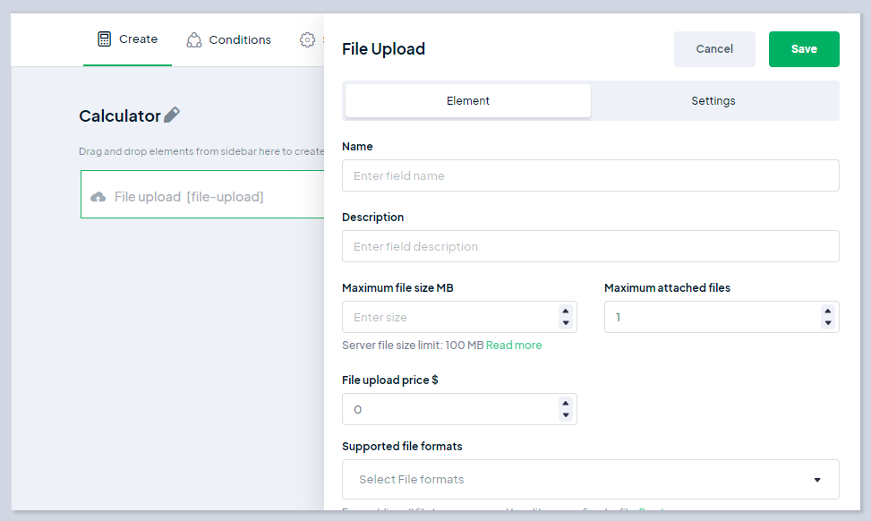 To add the **File Upload** element to your calculator simply drag and drop the element to your preferred place of the calculator.  Fill in the fields based on your preference and save the changes.