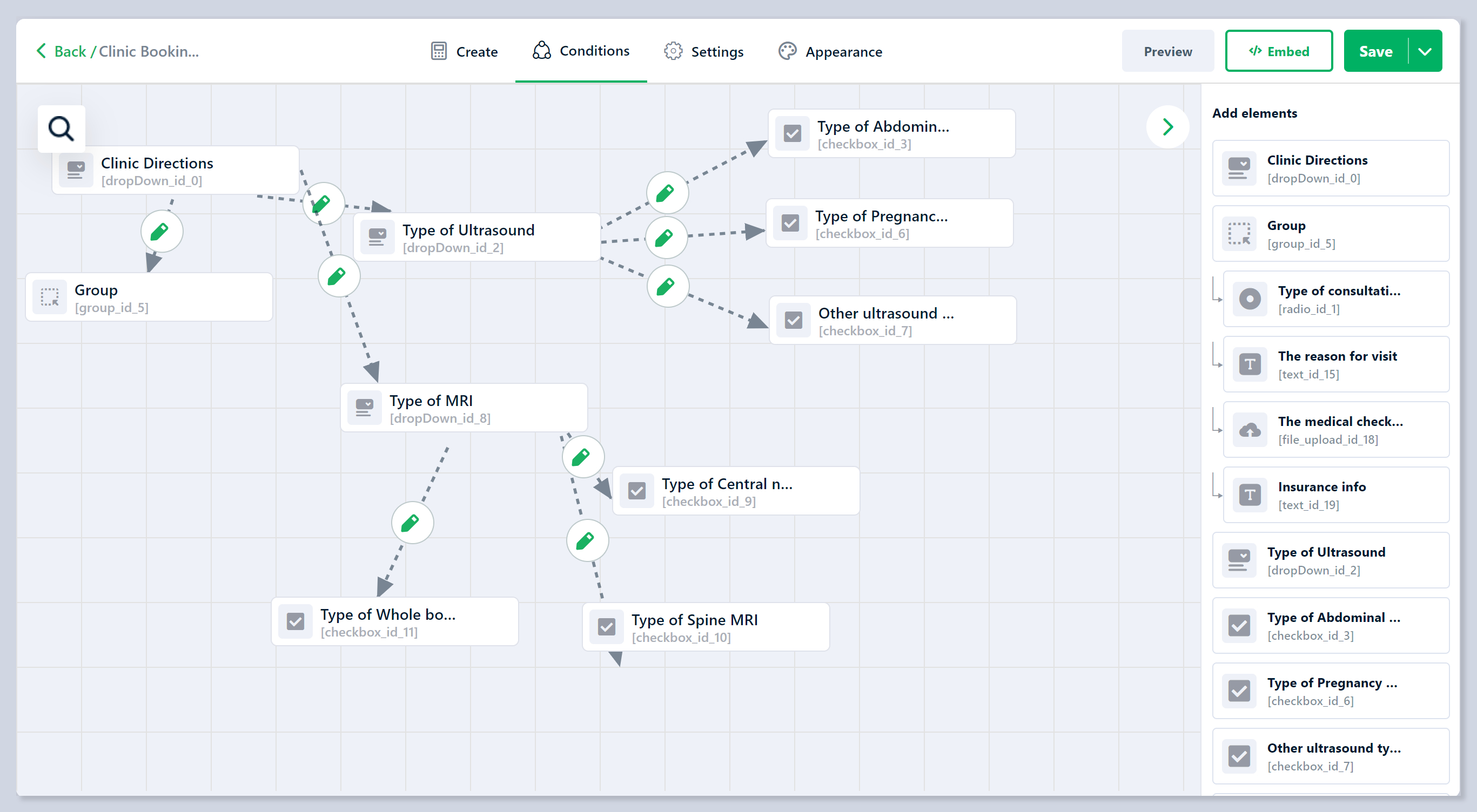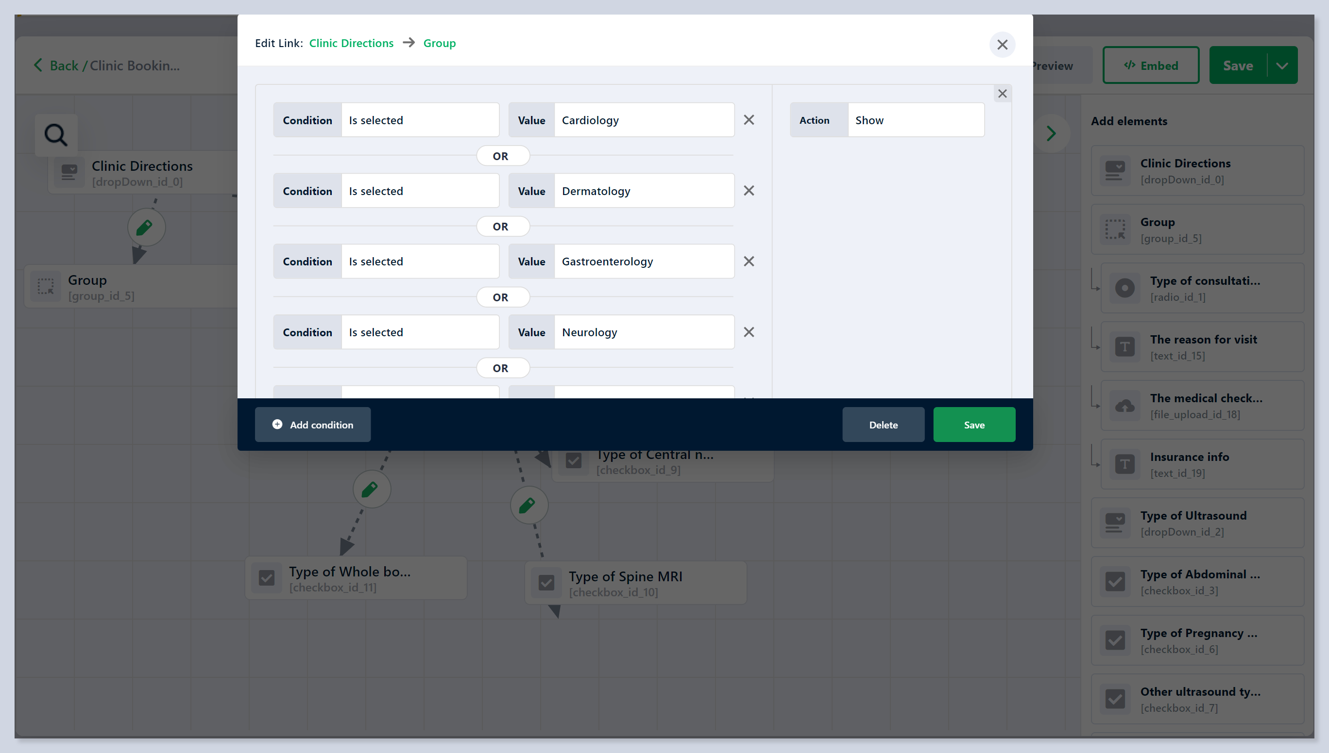 Then you can set up the conditions to show the Group if your customer chooses the certain types of clinic directions.