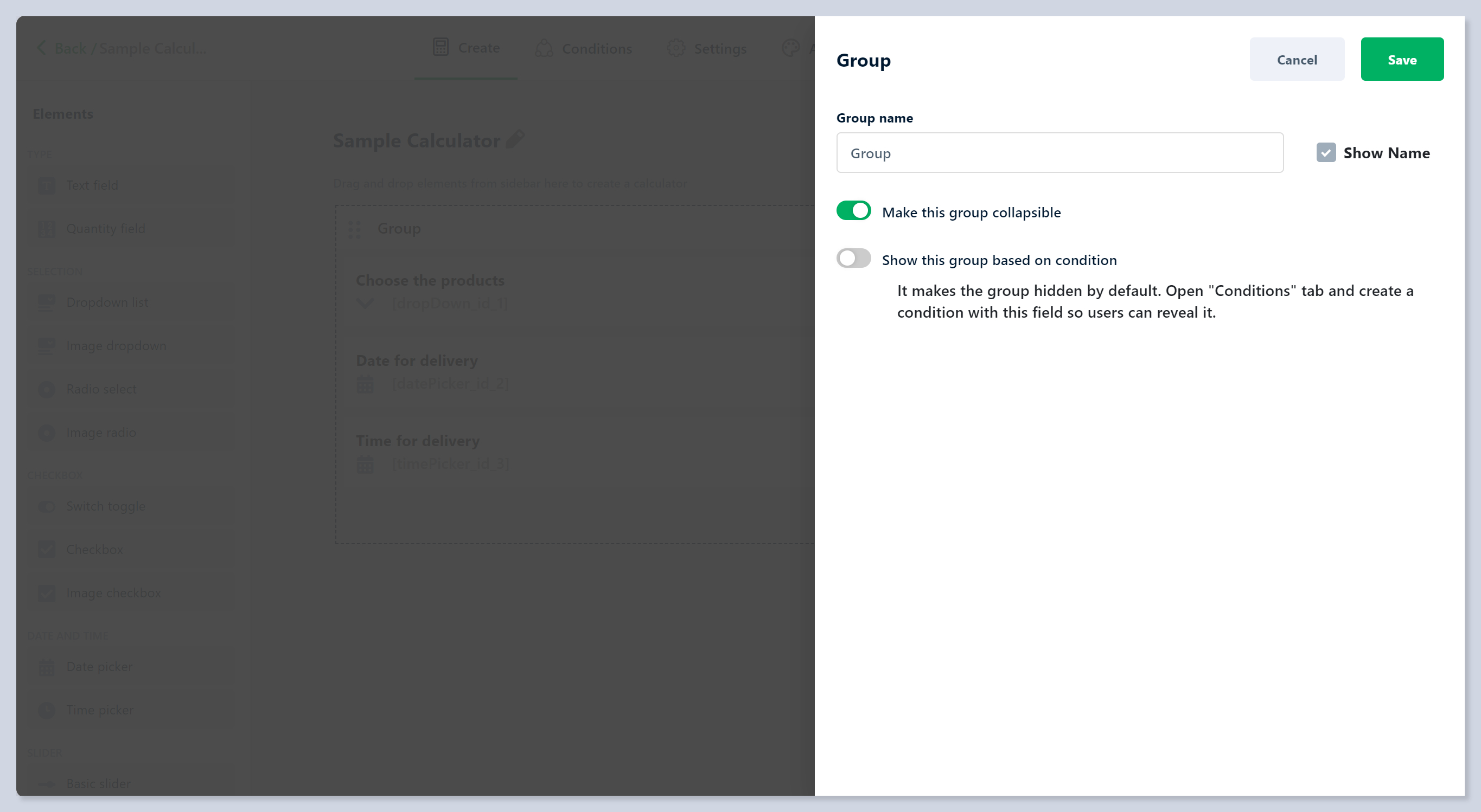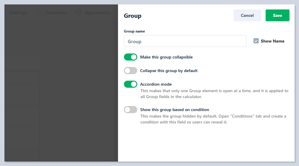 * **Show Name** -  Tick the checkbox if you want to show the name of the Group element in the calculator.