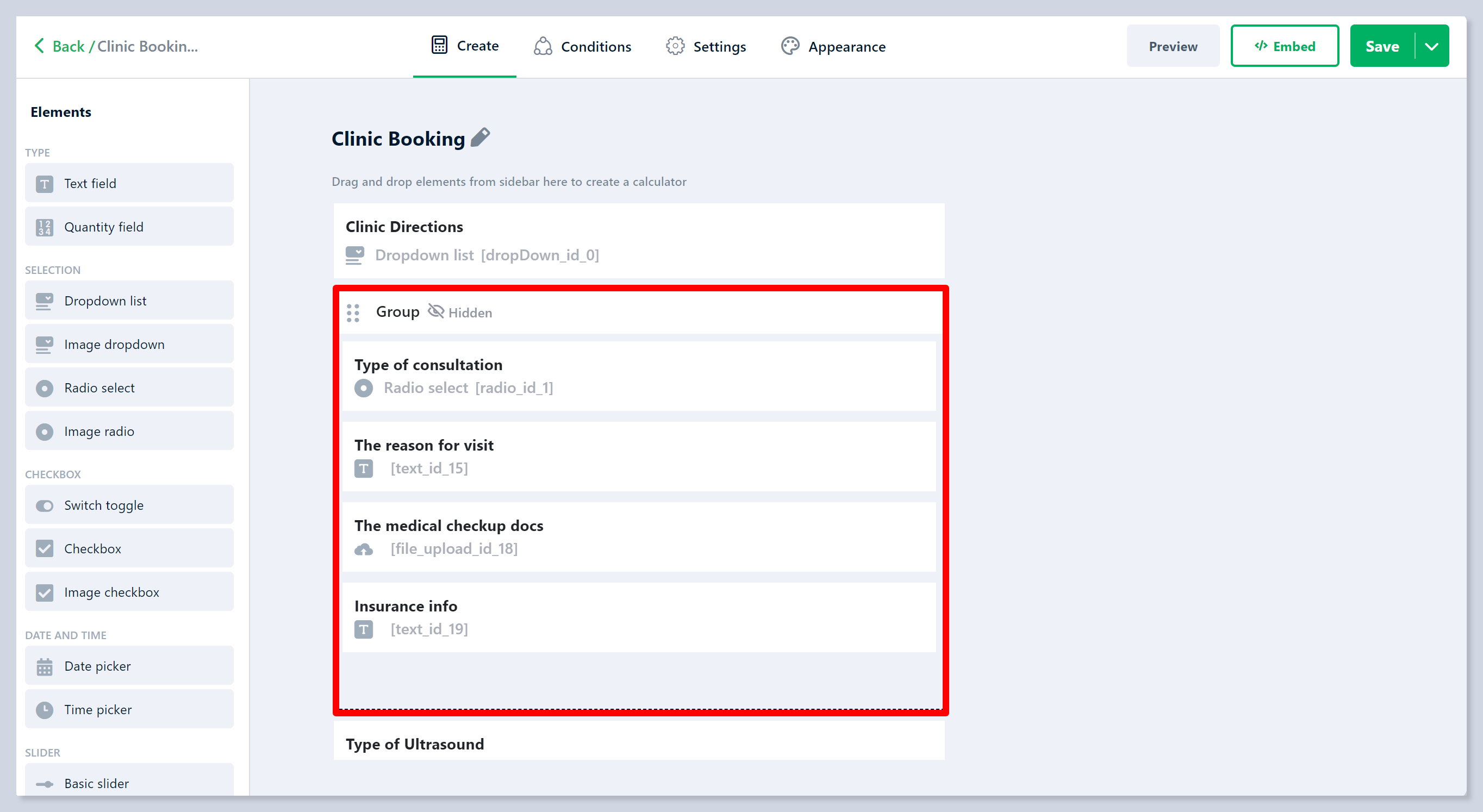 Let’s take an example of a clinic with different services. You can use a Group element if you want to know more about the patients before the consultation. You can add a Group with elements asking for extra info about the client such as the type of consultation, short details about the reason for the visit, uploading medical checkup docs, etc.