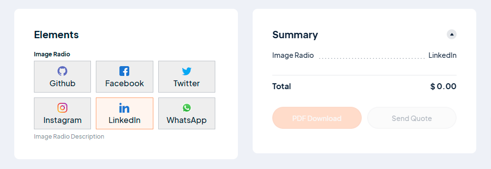 The Image Radio element is similar to the existing Radio button element. However, the element allows you to add radio button options with a set of images for customers to choose one among them.