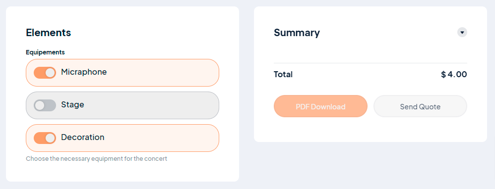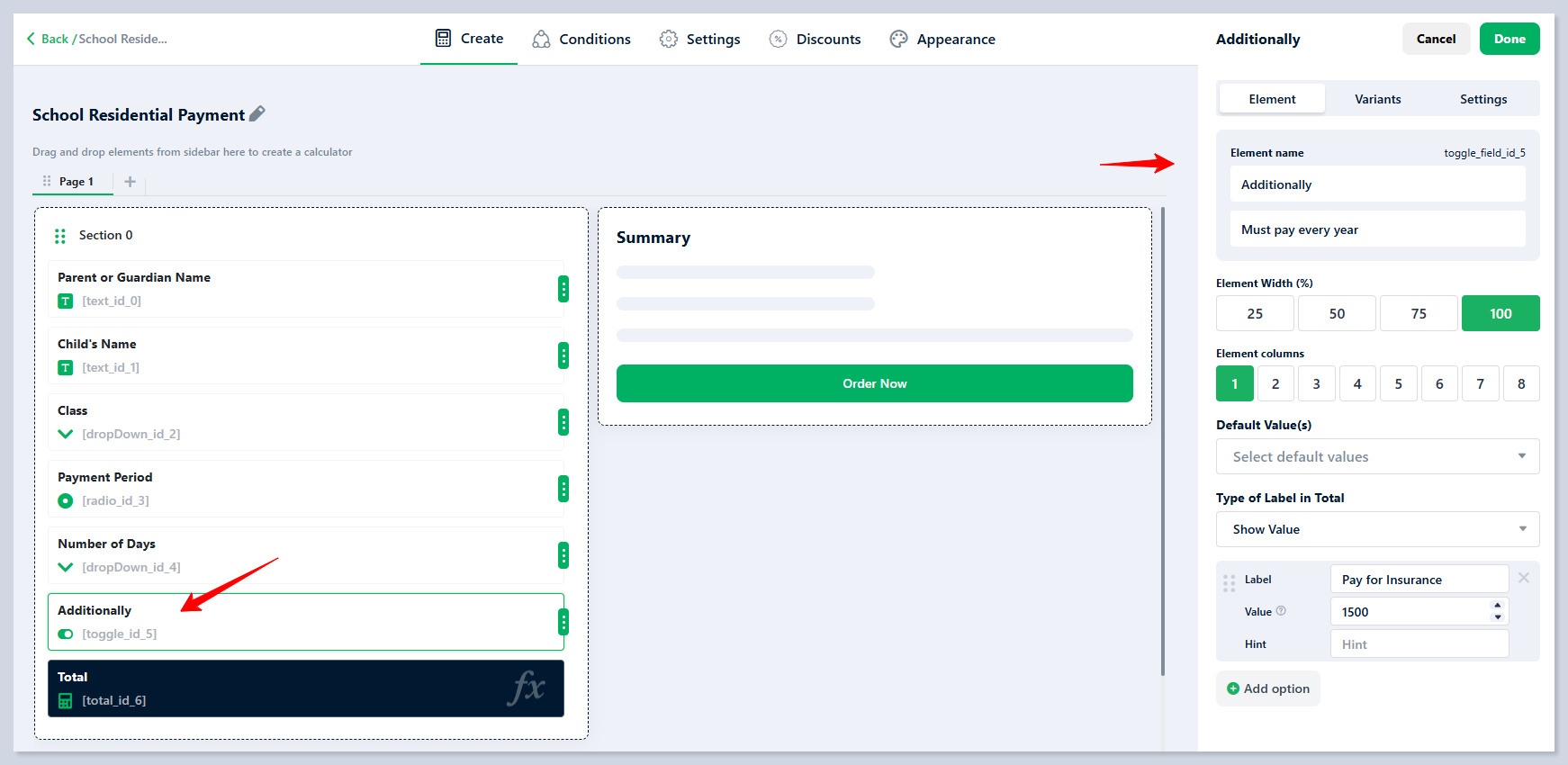 Let’s see an example of the Switch Toggle in the School residential payment template. It will be used for users whether they want to have insurance or not.