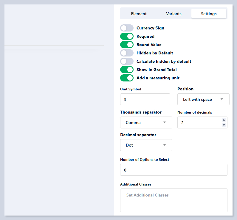 * **Show in Grand Total** - Disable if you want to hide the element in Grand Total.