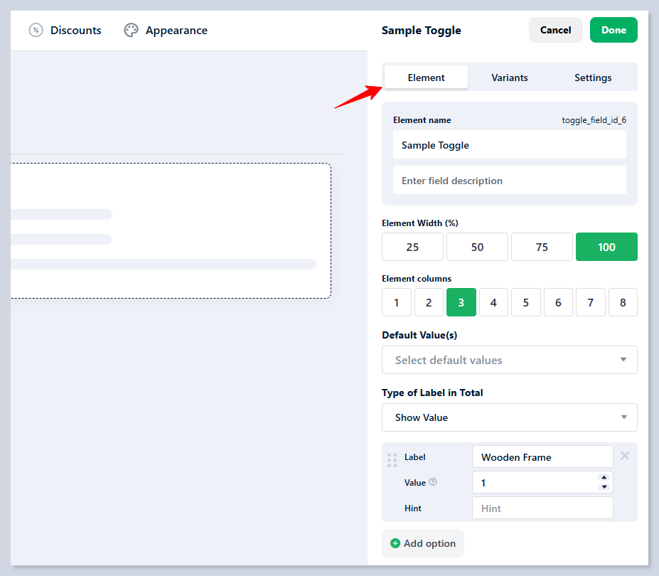 * **Element Columns** - Select into how many parts the width of the element should be divided to display the options. This helps organize switch toggle options into multiple columns. It is especially useful when there are many options, making them easier for users to view and select. If 3 is selected, all the options will be displayed in three raws.