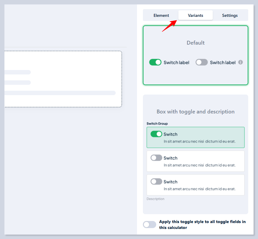 * **Apply this toggle style to all toggle fields in this calculator** - When the option is enabled selected style will be applied to all toggle elements in the calculator which is being edited.