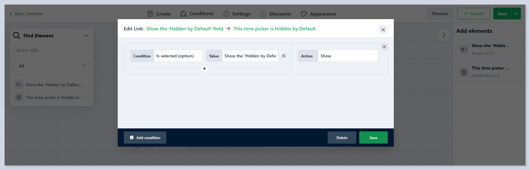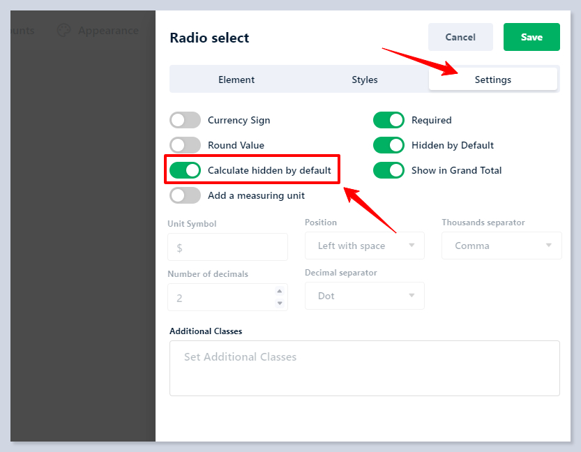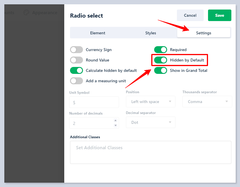 If enabled, the element will be hidden in the calculator and its value will be counted as zero in [**formula fields**](https://docs.stylemixthemes.com/cost-calculator-builder/calculator-elements/total). By utilizing the conditional system of the Cost Calculator, you can make the element visible again if it meets the specified condition by using the '**Show**' action:
