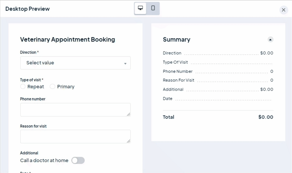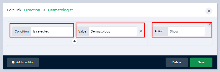 You can choose actions after you set up condition options and values. Let's take the Veterinary Appointment Booking calculator. So if you choose the "is selected" condition, "Dermatology" from the value and "show" from the option.&#x20;