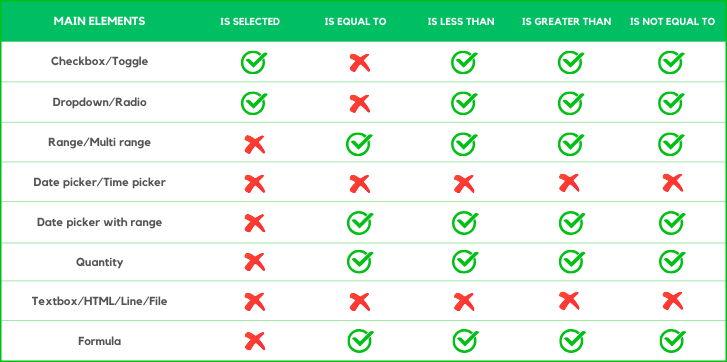 1. After choosing Calculator elements created in a calculator, only those elements will be listed in your condition area. Since this feature is dynamic, you cannot put conditions related to an element that does not exist.