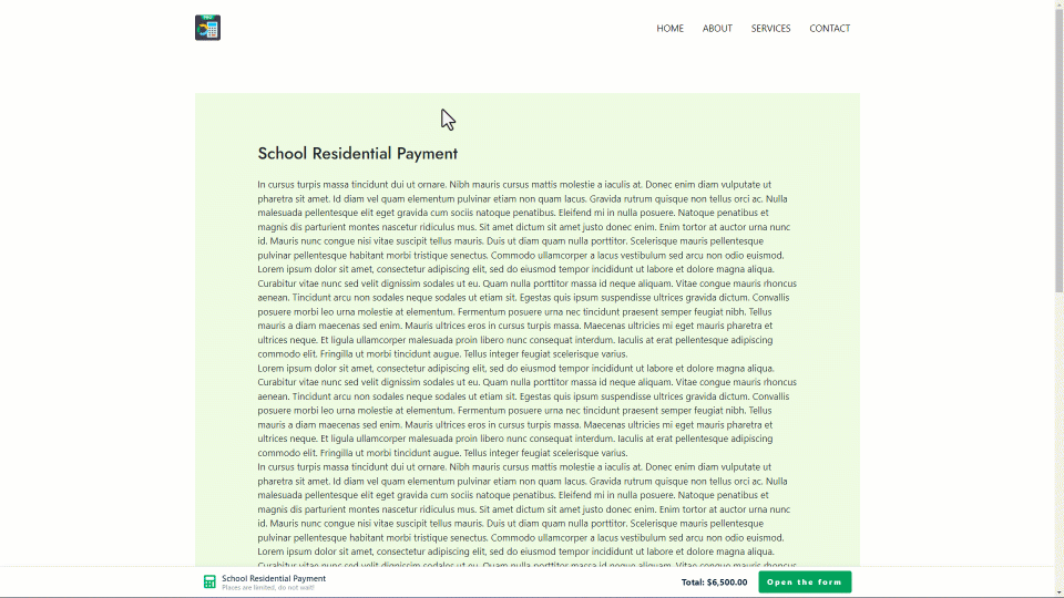 This option displays the calculator as a clickable button that remains in a fixed position on the screen. When clicked, the button can either open the calculator in a pop-up window or scroll the page to the calculator. This flexibility allows users to interact with the calculator without leaving their current position on the page, maintaining a clean and attractive user interface while ensuring easy access to its functionalities.