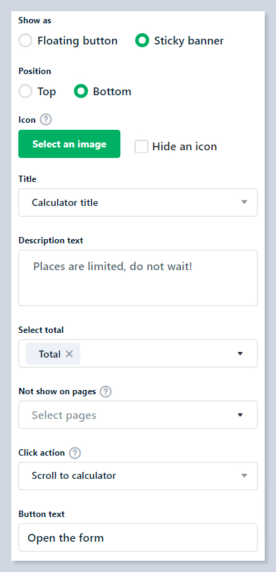 Only **one calculator** can be used with a sticky banner. Any additional calculators set to use a sticky banner will automatically become floating buttons!