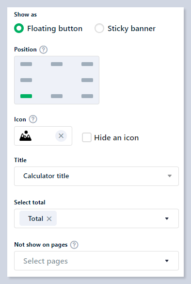 The **Sticky Calculator** feature adds a floating button or sticky banner to your pages, keeping the calculator visible as users scroll. Both options provide easy access at any time, enhancing usability and engagement. This setting is straightforward to enable and can be adjusted to fit any page layout.