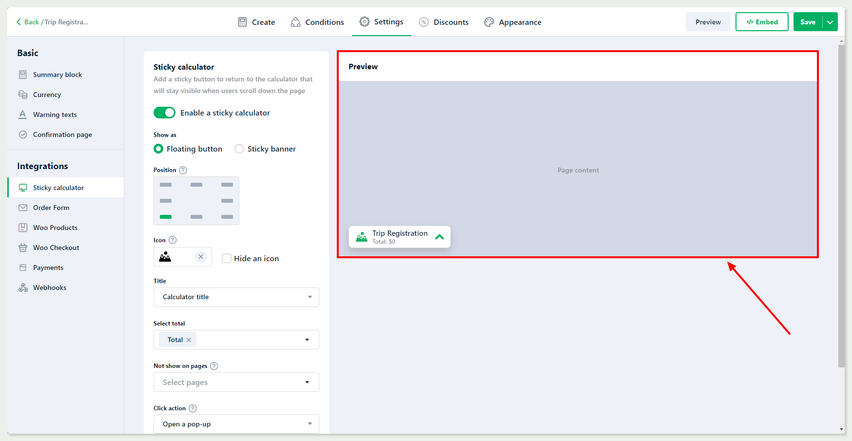 On the right side of the page, you'll see a **preview** of the sticky calculator. Your changes will be displayed here **immediately**, helping you visualize how the calculator will look on the page.