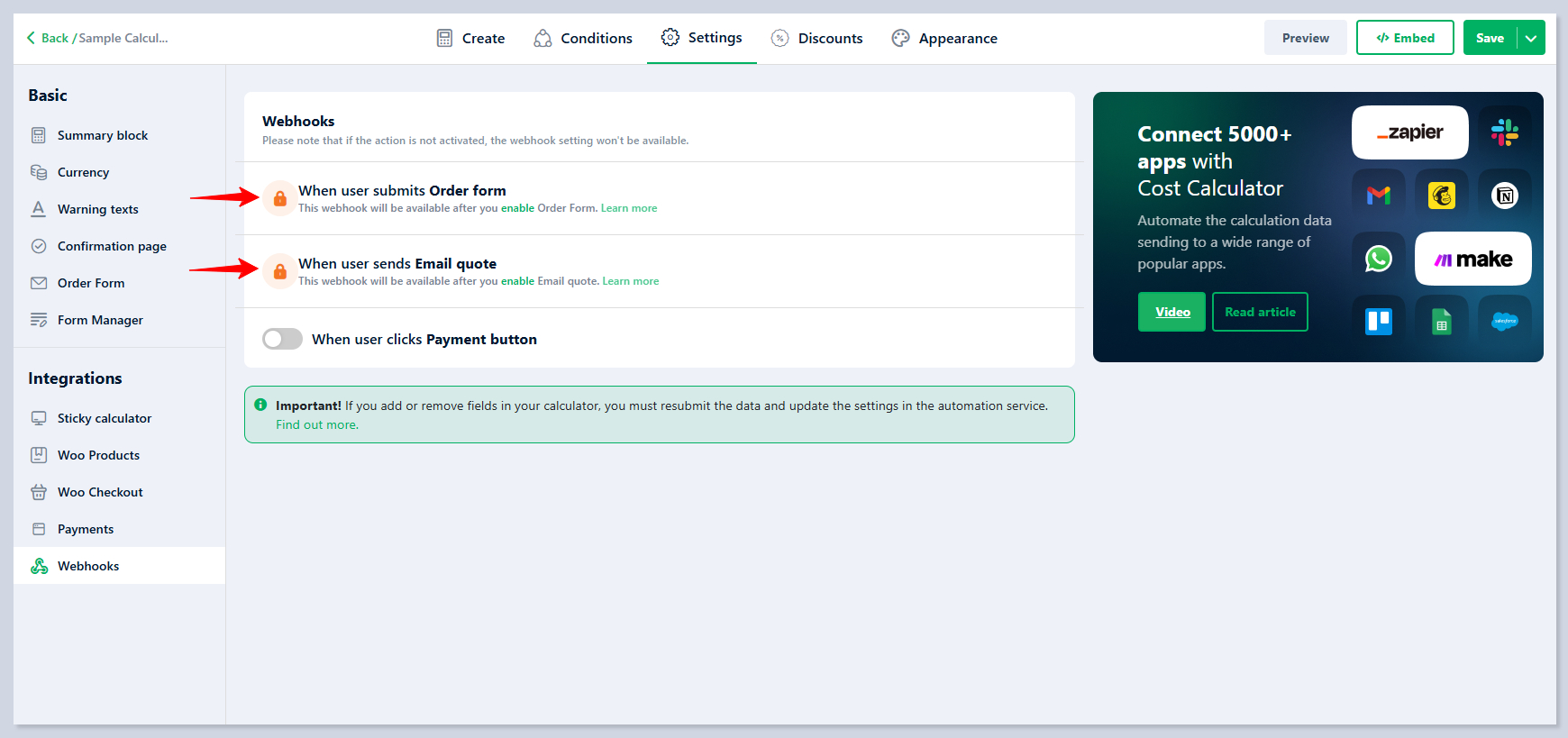 To use the Webhooks feature simply navigate to calculator settings and enable one of the available events: