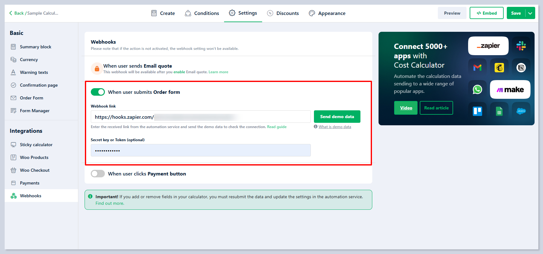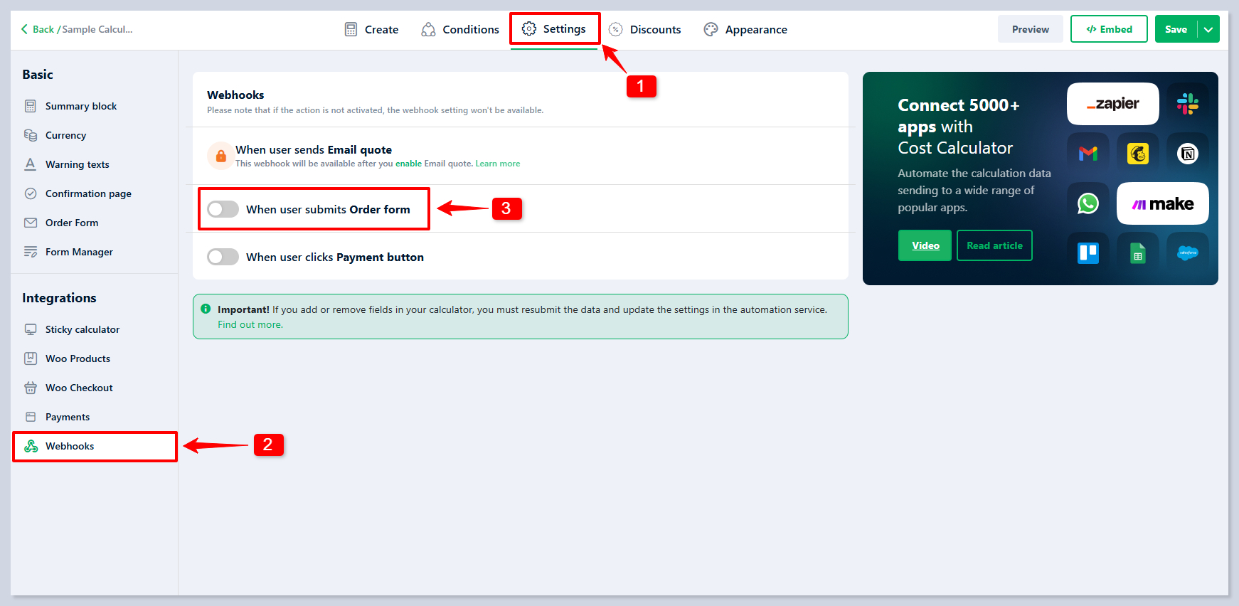 Webhooks can be added for [**Calculator Settings**](https://docs.stylemixthemes.com/cost-calculator-builder/cost-calculator-settings/calculator-settings) by editing their settings: