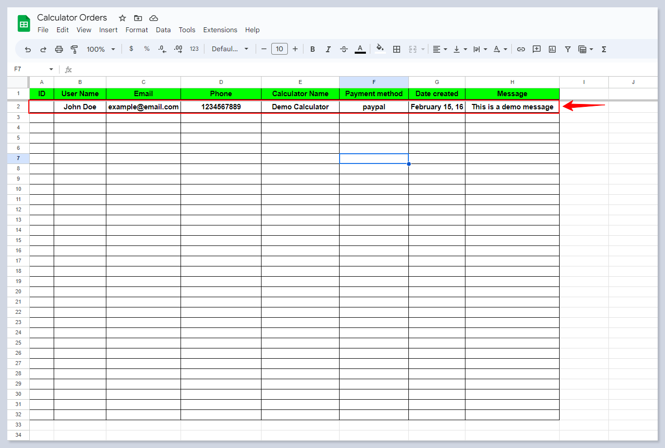 If we check our spreadsheet, we can see that a new row has been added with order details:
