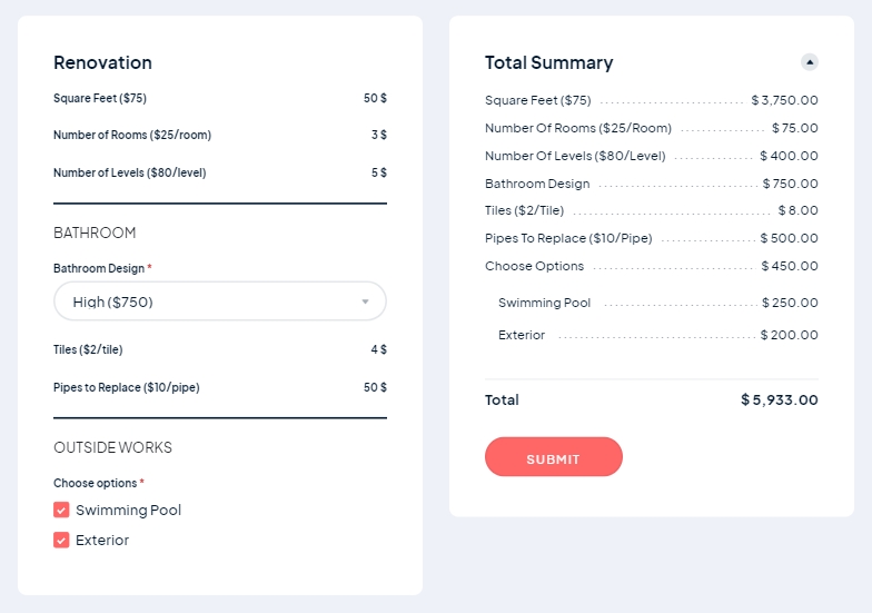 Building Houses takes a great deal of expenses. If you are in the remodeling or renovation business, you might have some fixed cost of services according to a house size and shape. With our Cost Calculator Builder you can make a cost estimation tool for your clients in order to help them budget for the house renovation.