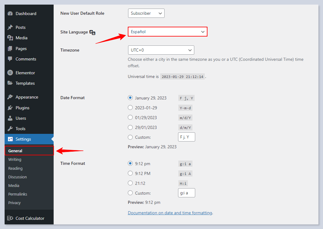 Before you start translating the plugin, you need to make sure that the language of WordPress matches the language you want to translate. To change the language go to Dashboard > Settings > General and choose your language in Site Language.