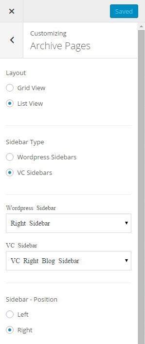 The blog page can have the sidebar on the left, right or no sidebar, and the contents of the sidebar, as described above, are set under the Appearance -> Widgets. Other settings of this archive page you can setup via Appearance -> Customize -> Archive pages:
