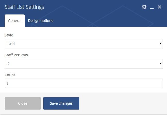 There are two view types how to display your company Team: List and Grid. You can add Staff List VC element in a page and set its options up: