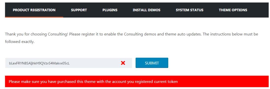 Token in use is registered under the wrong ThemeForest account. If you have access to multiple ThemeForest accounts, make sure you’re logged into the correct account that you’ve purchased with. Generating a Personal Token using an account that doesn’t have purchased will render the token invalid when used in Product Registration field.