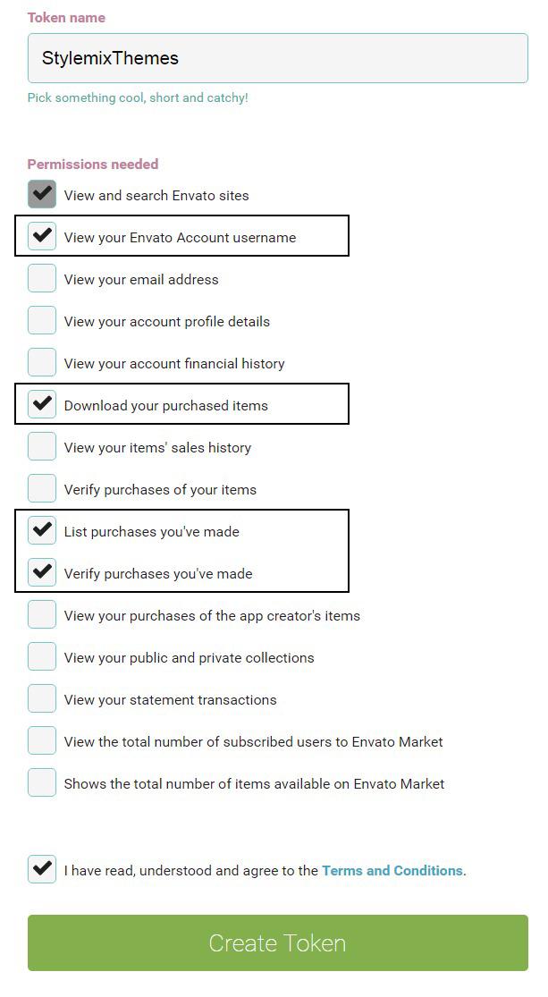 2. Enter a name for your token, then check the boxes for View Your Envato Account Username, Download Your Purchased Items, Verify Purchases You've Made and List Purchases You've Made from the permissions needed section. Check the box to agree to the terms and conditions, then click the Create Token button.