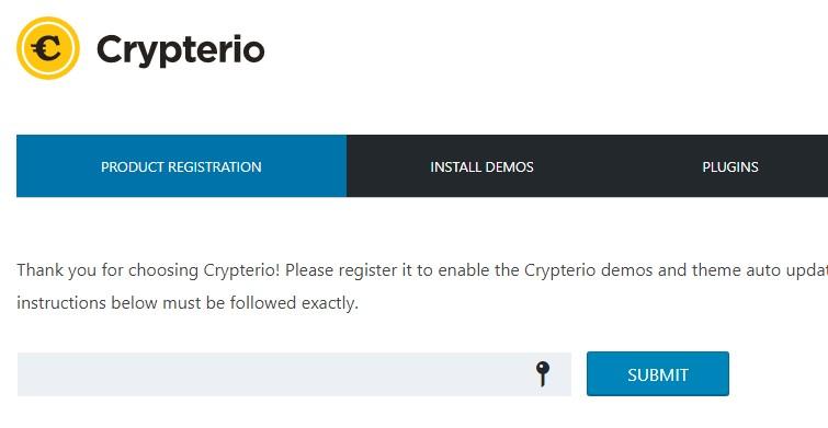 After completing the installation of the theme, you need to activate your product under Dashboard -> Crypterio following these instructions: