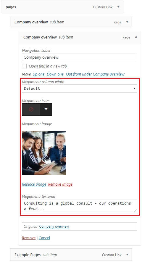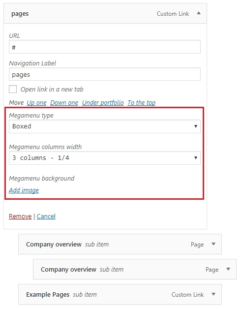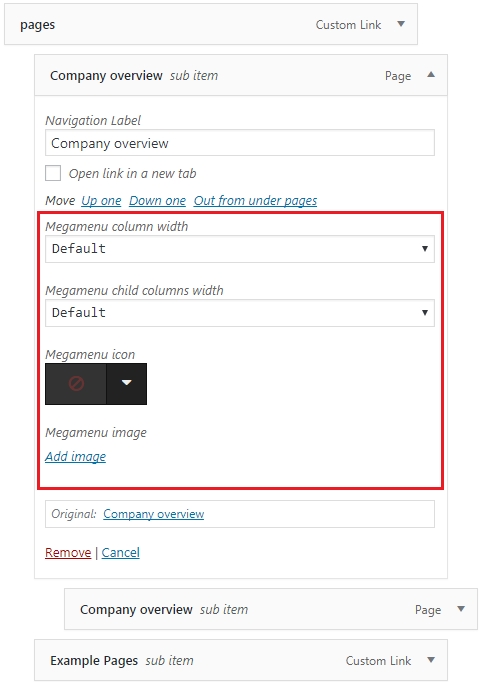 Mega Menu child elements also have special options such:
