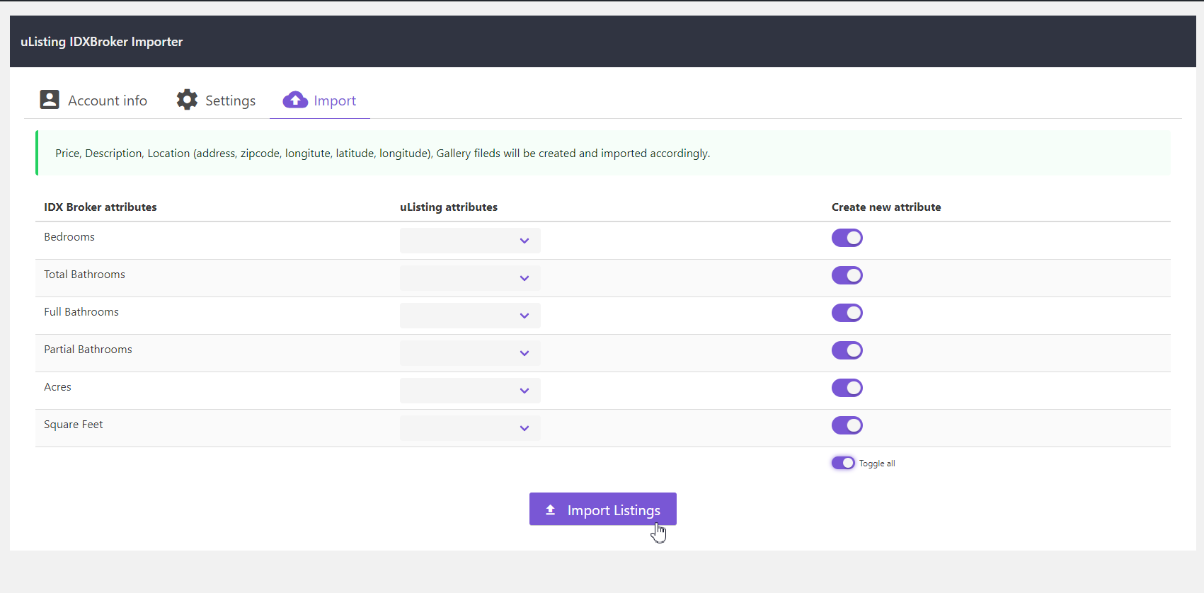 Also, there is a possibility of importing IDX Broker fields selectively. You need to just switch a toggle opposite of the field name. You can just enable Toggle all in order to activate all fields and click on Import Listings button.