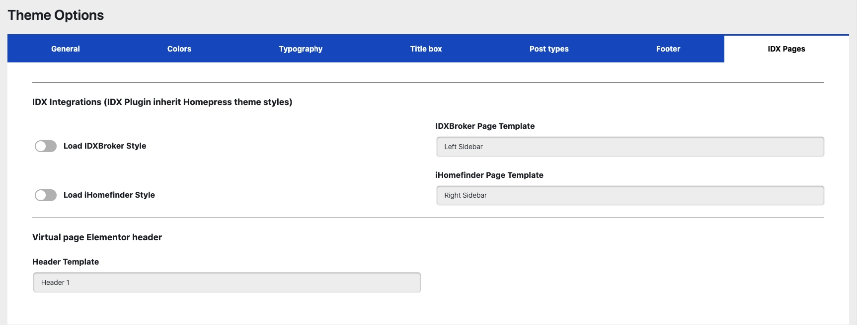 Go to Theme Options > IDX Pages. Here you can choose page template for IDX plugin pages. There are options for IDXBroker and iHomefinder.