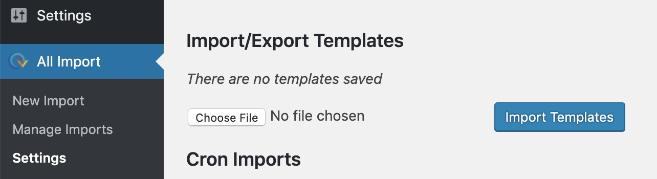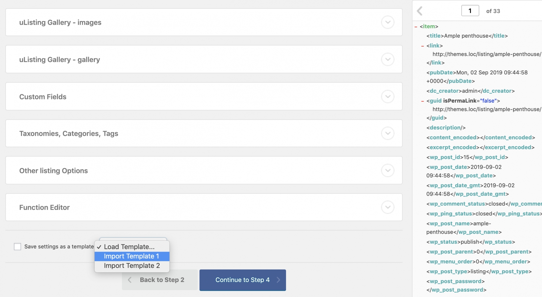 After installing and activating WP All Import and uListing plugins, you can import ready templates via WP All Import > Settings: