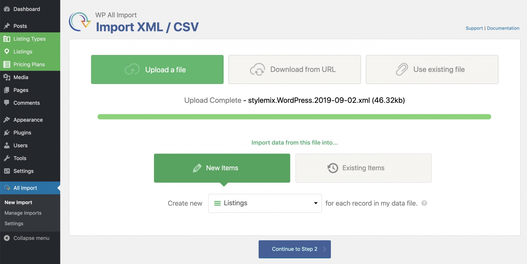 Now you are ready to import your properties via WP All Import > New Import. You need to choose Listings type for import: